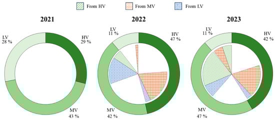 Vigour levels percentage distribution observed over the three years (HV, MV, LV). Internal pie charts show percentage changes between one level of vigour and the others.