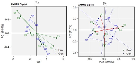 (A) AMMI1 biplot presenting mean grain yield versus PC1; (B) AMMI2 biplot showing PC1 and PC2 scores of nine wheat genotypes tested in eight environments. G: wheat genotypes, E: environments.