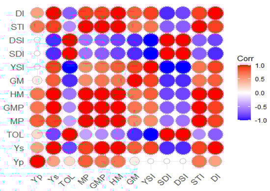 The correlation coefficients between drought tolerance indices were performed using pooled data for nine wheat genotypes in six cases (Figure 2). Crop yield under normal irrigation (Yp) showed a positive correlation with MP, GMP, HM, STI, and DI. Crop yield under stress (Ys) was found to be positively correlated with MP, GMP, HM, GM, YSI, STI, and DI. Ys, on the other hand, had negative correlation coefficients with TOL, SDI, and DSI. The highly positive indices correlated with Yp and Ys were MP, GMP, HM, and STI.