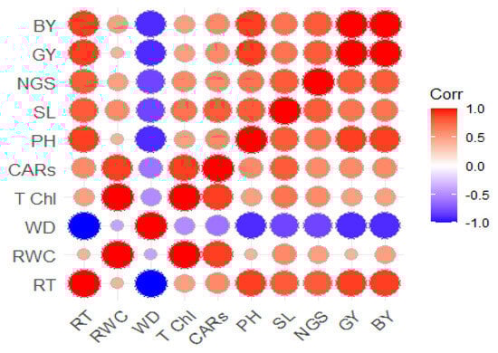 Correlation heatmap for studied traits. GY: grain yield; RT: relative turgidity; RWC: relative water content; WD: water deficit; T Chl: total chlorophyll; CARs: carotenoids; PH: plant height; SL: spike length; NGS: number of grains per spike; BY: biological yield.