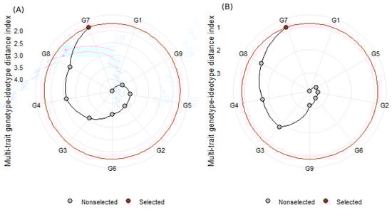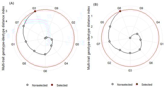 The MGIDI was assessed to determine the optimal genotype in each environment [36]. All the analyzed attributes must be thoughtfully planned for use in this indicator. The ten studied traits were used for each of the eight environments. The phenotyping procedure was based on a two-way table rescaling of best linear unbiased prediction (BLUP) for genotypes and traits [38]. After applying the factor analysis to cluster correlated traits into factors, the factorial scores for each genotype were estimated after the varimax rotation criterion [67]. The MGIDIi index was computed by the formula: