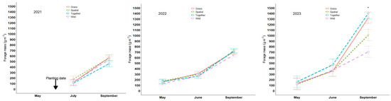 Mean forage mass in the four planting treatments 2021–2023. Means are plotted ± 1 SE. An asterisk (*) denotes a significant difference among treatments at p = 0.05. Legend: Grass: NWSGs planted before WFs, Spatial: NWSGs and WFs planted separately, Together: NWSG/WF seed mixed together, and Wild: wildflowers planted before NWSGs.