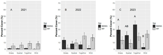 Percent ground cover of native warm-season grasses (NWSGs) and wildflowers (WFs) across treatments in 2021 (A), 2022 (B), 2023 (C). Means did not differ among treatments (p = 0.05) in 2021 and 2022. Means are plotted ± 1 SE. The x-axis labels are ‘Grass’: NWSGs planted before WFs, ‘Spatial’: NWSGs and WFs planted separately, ‘Together’: NWSG/WF seed mixed together, and ‘Wild’: wildflowers planted before NWSGs. Same letters indicate no statistical difference in NWSG cover among treatments (p < 0.05).