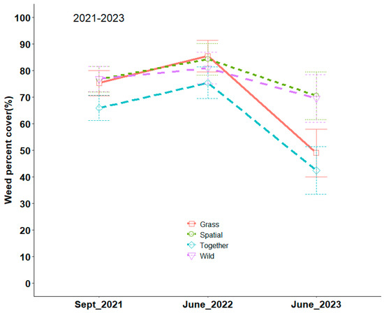 Plant species composition was assessed visually using a modified Daubenmire cover class method in September 2021, June 2022, and June 2023 [20]. Cover categories were reported as % ground cover. Single species cover analysis included the thirteen sown NWSGs and WFs. Cover categories combined to include NWSG cover, WF cover, and weed cover. Weed cover included all unsown species observed, including red and white clovers.