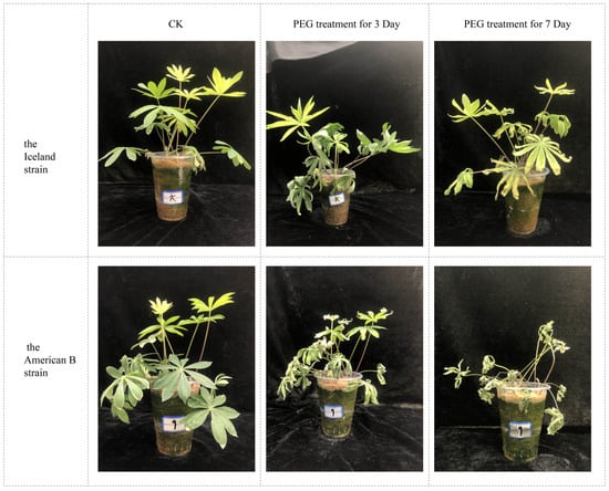 All specimens were divided into three groups in this study, including the control group, 24 h for the PEG stress group and 72 h for the PEG stress group. All of the leaves were stretched, and the color was normal in the control group. The PEG (polyethylene glycol) solution was used to simulate the PEG stress. The edge of the leaf began to curl slightly when under PEG stress for 24 h. With the longer exposure to PEG stress, its curling degree grew more seriously, and it eventually withered (Figure 1). It can be observed that the condition of the Iceland germplasm was better than the American B germplasm.