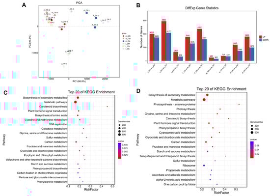We conducted principal component analysis (PCA) based on the transcriptional expression profiles of two Lupinus polyphyllus treated with PEG-6000 at different times. The first two principal components explained the variance of 66.8% (PC1) and 17.9% (PC2) between samples of two lupine germplasm under different osmotic stresses (Figure 3A). Compared with CK, as the PEG-6000 treatment time continued, the number of DEGs increased in two Lupinus polyphyllus (Figure 3B). Compared with CK, the Icelandic germplasm had the highest number of DEGs mapped to metabolic pathways at 72 h of stress (Figure 3C). Secondly, there was a significant enrichment in secondary metabolic biosynthesis, amino acid biosynthesis and carbon metabolism pathways. In the comparison group of A-CK vs. A-72 h, we identified that DEGs were mainly enriched in metabolic pathways, secondary metabolic biosynthesis and carbon metabolism pathways (Figure 3D). On the whole, the KEGG enrichment analyses indicated that biosynthesis of secondary metabolites and metabolic pathways played a critical role in the Iceland germplasm and the American B germplasm.