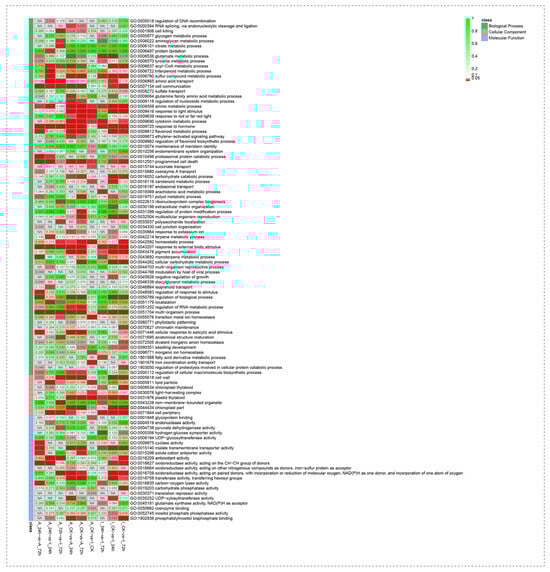 The analysis of the cellular component, molecular function and biological process was completed by mapping GO database. The specific structure and metabolic pathway between the Iceland germplasm and American B germplasm were demonstrated, such as glycoprotein binding, iron coordination entity transport and the homeostatic process (Figure 4). Oxidoreductase activity played an important role in Iceland germplasm and American B germplasm under PEG stress. Significant apoptosis also occurred in the American B germplasm instead of the Iceland germplasm. Moreover, the acyl−CoA metabolic process played a significant role in PEG stress of the Iceland germplasm and American B germplasm. The results show that the sulfur compound metabolic process exhibits significant differences under PEG stress, which indicates that the genes related to light stimulation and external biological stimulation are significantly different.