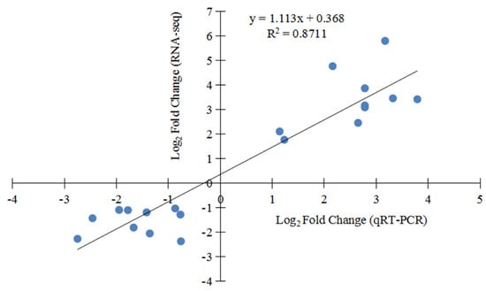 To verify the accuracy of RNA-seq data of Lupinus polyphyllus under PEG-6000 stress, a total of 20 DEGs participating in Lupinus polyphyllus under PEG stress were randomly selected for qRT PCR in this study. The results showed that the qRT PCR results were generally consistent with the RNA seq data, with a high correlation coefficient (R2 = 0.8711), which confirmed the RNA-seq results (Figure 7).
