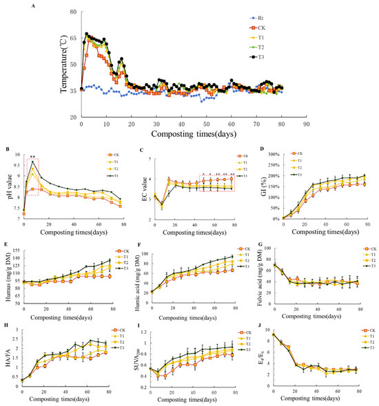 Effects of biochar addition on (A) temperature, (B) matrix pH, (C) electrical conductivity (EC), (D) germination index (GI), (E) total humus, (F) humic acid (HA), (G) fulvic acid (FA), (H) HA/FA, (I) SUVA280, and (J) E4/E6 during composting. CK, control, without biochar addition; T1, 2.5% biochar treatment; T2, 5% biochar treatment; T3, 7.5% biochar treatment. * means p < 0.05; ** means p < 0.01.