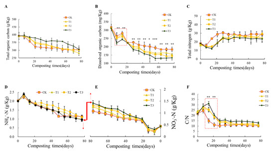 Effects of biochar addition on C and N conversion during the composting process. (A) total organic carbon (TC), (B) dissolved organic carbon (DOC), (C) total nitrogen (TN), (D) NH4+-N, (E) NO3−-N, (F) C/N ratio. The red arrow showed that the conversion of NH4+-N to NO3−-N in compost products at different sampling times. CK, control, without biochar addition; T1, 2.5% biochar treatment; T2, 5% biochar treatment; T3, 7.5% biochar treatment. * means p < 0.05; ** means p < 0.01; *** means p < 0.001.