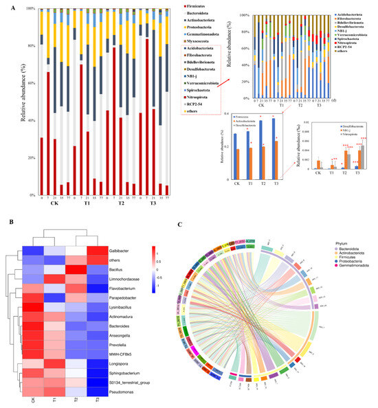 Relative abundance of the predominant bacterial community at the phylum level (A), genus levels (B), and circos at phylum (C) during composting. “Others” have a relative abundance of <1%. * means p < 0.05; ** means p < 0.01; *** means p < 0.001.