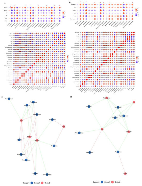 Relationships between bacterial community and C and N conversion or humification properties based on Pearson results (A,B) and Spearman results (C,D). Red and blue colors represent positive and negative correlations in the Pearson results, respectively. Red and green lines represent positive and negative correlations in the Spearman results, respectively. Pink and blue nodes represent C-N conversion and humification, respectively, with the size indicating the connectivity. * means p < 0.05.