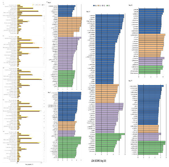 Effects of biochar on biomarkers during the composting of a mixture of chicken manure and Flammulina velutipes waste. (A) C and N metabolism; (B) LDA scores of biomarkers in different treatments based on an LEfSe analysis during composting. Gene families are colored by functional categories. CK, control, without biochar addition; T1, 2.5% biochar treatment; T2, 5% biochar treatment; T3, 7.5% biochar treatment. * means p < 0.05; ** means p < 0.01; *** means p < 0.001.