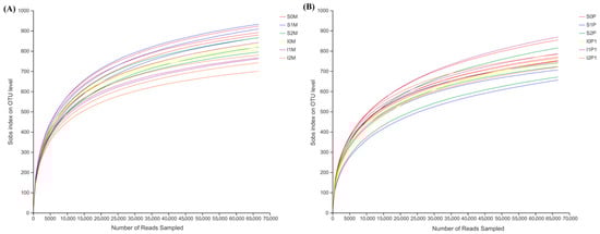 Rarefaction curves of maize (A) and peanut (B) soil fungi sequencing were generated for the Sobs index at the OTU level under different treatments. The numbers 0, 1, 2 in the legends refer to 0, 150, 300 kg·hm−2 nitrogen application.