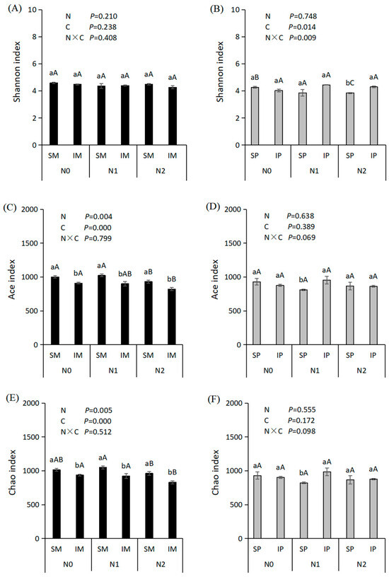 Fungal alpha diversity of maize (A,C,E) and peanut (B,D,F) soil under different treatments. N, nitrogen application effect; C, cropping pattern effect; N × C, the interaction effect of N fertilization and cropping pattern. The different lowercase letters indicate a significant difference between monoculture and intercropping system under the same N fertilization leavel at 0.05 level, and the different capital letters indicate a significant difference between different N fertilization levels under the same cropping pattern at 0.05 level.