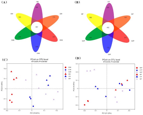 The fungal community structure similarity among all treatments was analyzed at the OTU level, and Venn diagrams were constructed to visualize the overlap (Figure 3A,B). For maize soil, a total of 631–685 OTUs were identified across all treatments, with 457 OTUs shared among all treatments and 174–228 OTUs unique to specific treatments. The total numbers of OTUs and unique OTUs under each N treatment followed the pattern N1 > N0 > N2, with average values of 673, 667, and 646 for total OTUs and 216, 210, and 189 for unique OTUs, respectively. The overall OTU numbers were higher in SM compared with IM, with average values of 676 and 648, respectively. Similarly, the number of unique OTUs was higher in SM compared with IM, with average values of 219 and 191, respectively. In peanut soil, 462 OTUs were shared among all treatments, and 169–225 OTUs were unique to each treatment. Similar to maize soil, the total numbers of OTUs and unique OTUs in peanut soil demonstrated the pattern N1 > N0 > N2, with total OTU numbers of 659.5, 653, and 642, and unique OTU numbers of 197.5, 191, and 177, respectively. The total numbers of OTUs and unique OTUs were higher in IP compared with SP, with total OTU numbers of 654 and 647, and unique OTU numbers of 192 and 185, respectively.