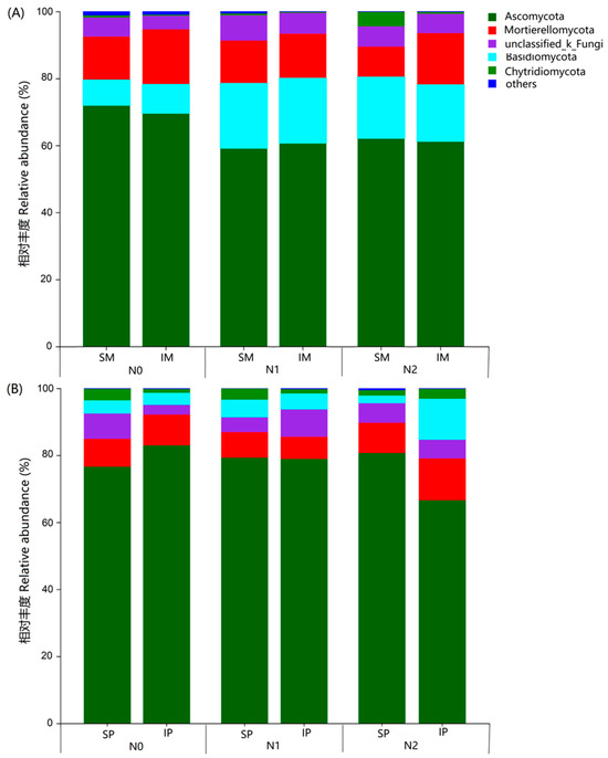 In the maize soil, the dominant fungal taxa were Ascomycota, Basidiomycota, Mortierellomycota, unclassified_k_Fungi, and Chytridiomycota (relative abundances > 1%), accounting for approximately 98.77% to 99.82% of the total fungal taxa (Figure 4A). Ascomycota was the most abundant phylum, ranging from 59.06% to 71.91%, followed by Basidiomycota, which ranged from 7.70% to 19.54%. The relative abundance of Ascomycota and Chytridiomycota first decreased followed by an increase with increasing N fertilization levels. The relative abundance of Ascomycota was 70.74%, 59.84%, and 61.60% in N0, N1, and N2, respectively, while that of Chytridiomycota was 0.48%, 0.40%, and 2.43%, respectively. Conversely, the relative abundance of Basidiomycota was 8.23%, 19.53%, and 17.75%, and that of unclassified_k_Fungi was 4.86%, 6.86%, and 5.91% in N0, N1, and N2, respectively. Compared with the maize monoculture, intercropping increased the relative abundance of Mortierellomycota from 11.48% to 14.92% in maize soil, while decreasing the relative abundance of Ascomycota, unclassified_k_Fungi, and Chytridiomycota.