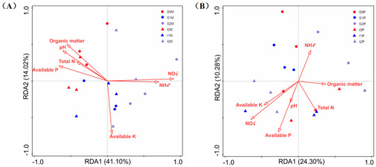 Redundancy analysis (RDA) of fungal community in maize (A) and peanut (B) soils.