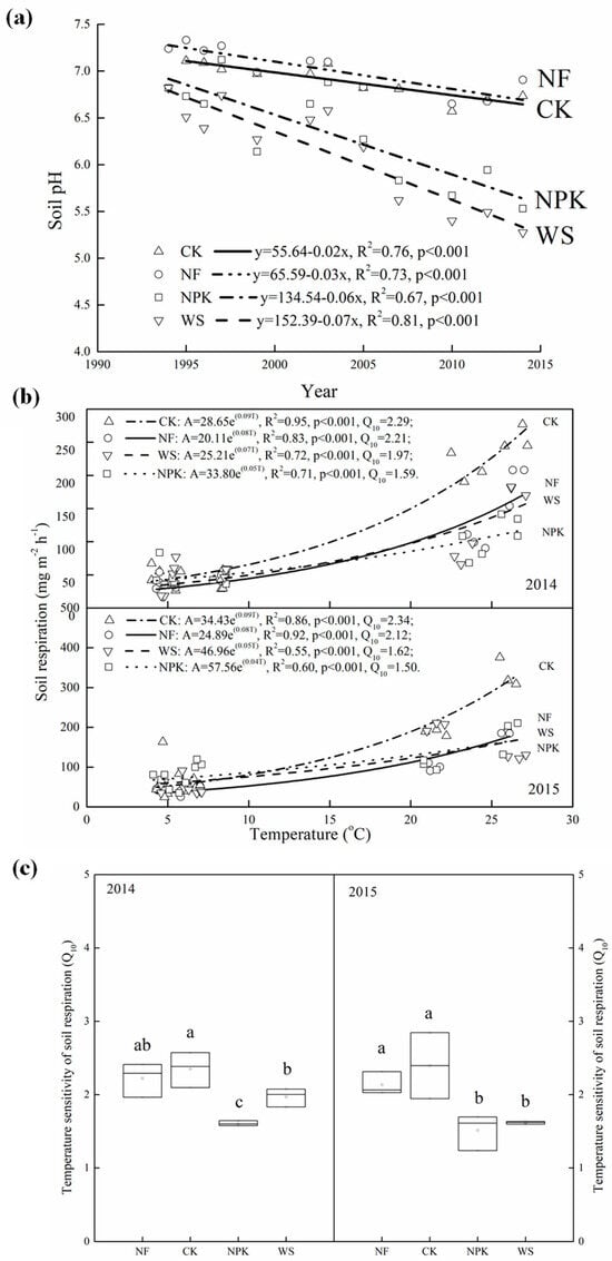 Soil pH from 1994 to 2014 (a); the temperature sensitivity of soil respiration (b); and ANOVA (c) under NF, WS, NPK, and CK treatments in 2014 and 2015. The different lowercase letters in the figure indicate significant differences at the p < 0.05 level.