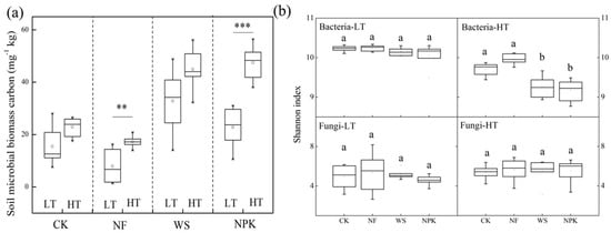 Soil microbial biomass carbon (mg kg−1) (a) and the Shannon index (b) of soil bacterial and fungal communities at low (LT: <10 °C) and high (HT: >20 °C) temperatures. The symbols *** and ** and the different lowercase letters denote significant differences at p < 0.001, p < 0.01, and p < 0.05 levels, respectively.