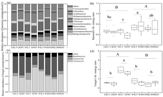 Relative abundances of soil bacterial (a) and fungal (c) compositions at phylum and class levels, and the ratios of r- and K-strategists (b,d) under CK, NF, WS, and NPK treatments at low (LT) and high (HT) temperatures. The different upper- and lowercase letters in (b,d) indicate significant differences between low and high temperatures for each treatment at the p < 0.05 level.