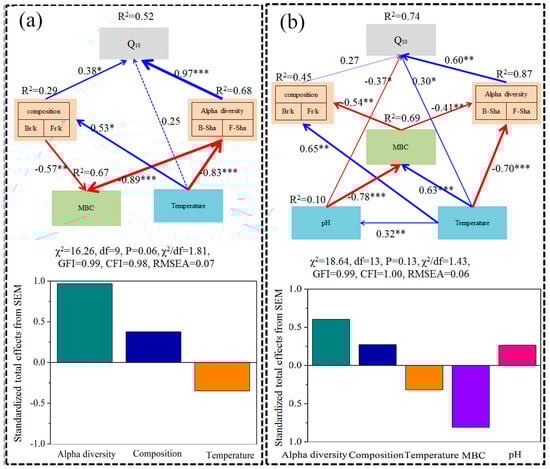 Factors and their total standardized effects on Q10 evaluated using SEM (a,b). The alpha diversity encompasses both the bacterial and fungal Shannon diversity and the bacterial and fungal r-/K-strategist ratios for microbial community composition. The Br/k and Fr/k represent Bacterial r-strategists/K- strategists and Fungal r-strategists/K- strategists, respectively. The colored arrows in the figure denote significant positive (blue) and negative (red) relationships (p < 0.05), with arrow thickness representing the strength of the relationship. The numbers adjacent to the arrows and the variances represent standardized path coefficients and the percentage of variance (R2) explained by the model. ***, **, and * indicate significant differences at the p < 0.001, p < 0.01, and p < 0.05 levels, respectively.
