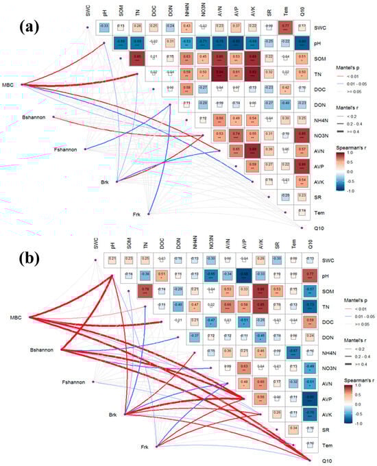 Spearman’s correlation analysis of microbial biomass carbon, Shannon diversity, r-/K-strategist ratio, and environmental factors at low (a) and high temperatures (b). Significance levels are represented by red, blue, and white lines for 0.01, 0.05 levels, and non-significant effects (p > 0.05), respectively. The width of the line corresponds to the strength of the relationship, measured by Spearman’s r value. Pairwise comparisons of soil properties, soil respiration, and temperature are depicted in the right panel. The color intensity of the correlation coefficients ranging from negative to positive varies from blue to red. Statistical significance is denoted by *** at p < 0.001, ** at p < 0.01, and * at p < 0.05.