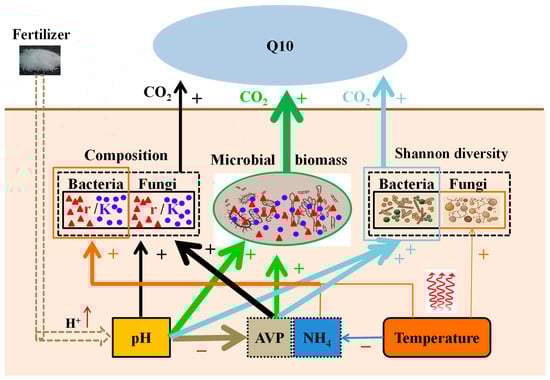Conceptual model of microbial mechanisms driving the Q10 of soil respiration as soil acidification caused by fertilization management. AVP means available phosphorus. The width of the arrow corresponds to the strength of the correlation coefficient. The plus signs indicate positive effects and the minus signs indicate negative effects.