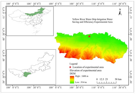 The experimental region is situated in the Yellow River Water Drip Irrigation Water Conservation and Efficiency Experimental region of Dalate Banner, Ordos City, Inner Mongolia Autonomous Region. The co-ordinates of the location are 40°29′32″ N, 109°53′10″ E, with an elevation of 1009 m. The location of the experimental area is shown in Figure 1. The Inner Mongolia Yellow River South Bank Irrigation District is one of the six major yellow diversion irrigation districts in the Inner Mongolia Autonomous Region. It is an important commodity grain base owned by both the state and the autonomous region. The irrigation district is situated in the northern part of Ordos City and is distributed in a narrow east–west strip. It has a typical temperate continental climate with semi-arid characteristics, characterized by large temperature differences between day and night and periodic rainfall and heat. The long-term average temperature is 6.2 °C, while the average annual precipitation is 348.3 mm. The majority of the precipitation occurs between July and September, accounting for approximately 70% of the total annual precipitation. Over the years, the average evaporation rate is around 2506.3 mm, which is roughly seven times higher than the amount of precipitation. The soil consists mostly of loamy and clay loam textures. The organic matter, total salt, nitrate nitrogen, and ammonium nitrogen content in the soil, within the 0–100 cm depth, are measured at 12.1 g·kg−1, 1.0 g·kg−1, 6.2 mg·kg−1, and 3.5 mg·kg−1, respectively.