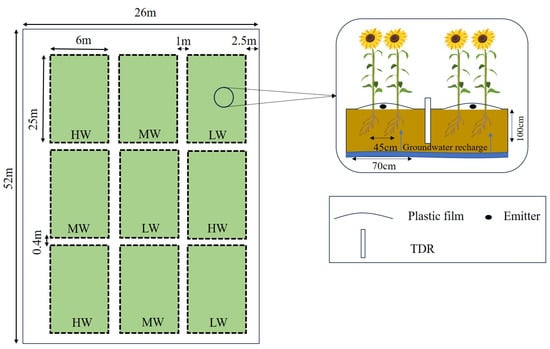 Hourly meteorological data, such as air temperature, rainfall, air humidity, solar radiation, atmospheric pressure, and wind speed, were gathered in the experimental region using automated weather stations (Tian Qiong Co., Ltd., Weifang, China). The Penman–Monteith formula [32] was used to calculate crop evapotranspiration (ET0). The potential crop evapotranspiration (ETP) is determined by multiplying ET0 with the crop coefficient (Kc) for sunflowers. According to data from FAO56, the recommended values for Kc at the beginning, middle, and end of sunflower fertility are 0.35, 1.1, and 0.4, respectively. In the HYDRUS-2D model, ETP is the sum of potential evaporation (EP) and potential transpiration (TP), which is calculated using the following equation [33]: