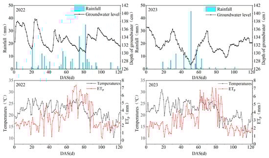 Depth to groundwater (cm), rainfall (mm) potential evapotranspiration (mm), and air temperature (°C) for the test years ((left) 2022, (right) 2023).