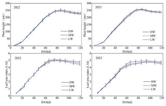Changes in plant height and leaf area of sunflowers under different drip irrigation rates in the experimental years (2022 on the (left) and 2023 on the (right)).