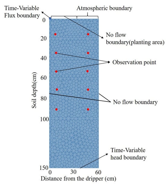 The simulation area has a rectangular shape with a width of 60 cm and a depth of 150 cm. The upper boundary is partially covered with a semi-film, while the saturated head boundary is located at the drip head during drip irrigation. The region covered with film represents a zero-flux boundary, while the piece not covered with film represents an atmospheric boundary. In the simulation region, the subterranean water reaches a maximum depth of 138.4 cm. As a result, the bottom boundary is defined as the saturated head boundary, while the left and right borders are symmetric surfaces on both sides, with zero flux limits. Figure 5 illustrates the simulation area of the model.