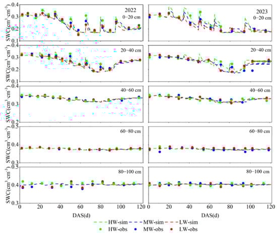 Figure 6 demonstrates that the soil water content of the HW treatment was greater than that of the MW and LW treatments. During the reproductive period in 2022, the HW treatment exhibited a 3.6% and 4.4% increase in water content at a depth of 0–20 cm compared to the MW and LW treatments, respectively. Similarly, at a depth of 20–40 cm, the HW treatment had a 1.9% and 3.0% higher water content than the MW and LW treatments. By mid-2023, the HW treatment exhibited a 6.0% and 4.68% increase in soil water content at a depth of 0–20 cm compared to the MW and LW treatments. Similarly, at a depth of 20–40 cm, the HW treatment showed a 1.9% and 3.0% increase in soil water content compared to the MW and LW treatments, respectively, with a difference of 3.2% and 3.0%. During the years 2022 and 2023, the soil water content in the top 20 cm of soil increased by 11.7% to 17.9% after a single irrigation for 3 days in the HW treatment compared to the MW treatment, and by 19.3% to 26.9% compared to the LW treatment. Similarly, in the 20–40 cm soil layer, the HW treatment had a 12.2% to 25.1% higher soil water content compared to MW and LW treatments, and an 11.3% to 15.4% higher soil water content compared to the 40–100 cm soil layer. However, the differences in soil water content between the HW, MW, and LW treatments in the 40–100 cm soil layer were small and almost indistinguishable (p > 0.1).