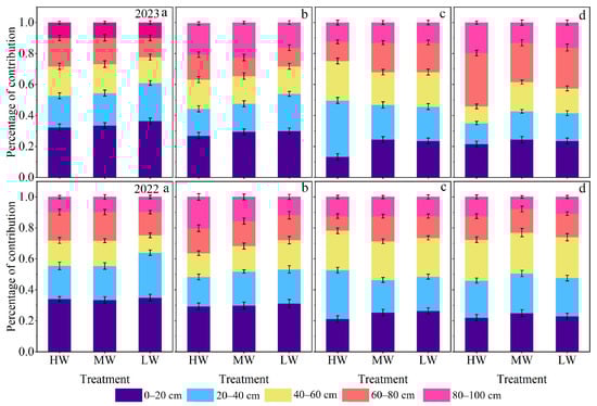 Proportion of water contribution from different soil depths in 2022 (bottom) and 2023 (top) (a, b, c, and d denote seedling, nodulation, irrigation, and maturity stages of sunflower, respectively).