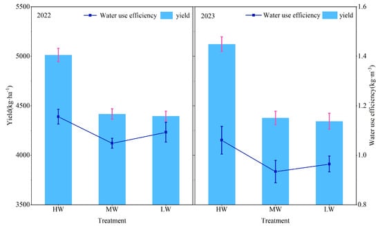 The impact of various amounts of drip irrigation on the production and water usage efficiency of sunflowers was observed and documented in Figure 8. Both years showed a significant difference (p < 0.05) between HW and both MW and LW treatments. However, there was no difference between MW and LW treatments. The average yield values for HW, MW, and LW treatments were 5069 kg·ha−1, 4396 kg·ha−1, and 4370 kg·ha−1, respectively. The HW treatment had a yield that was 15.3% and 16.0% higher than the MW and LW treatments, respectively. In terms of water use efficiency, there was a significant difference (p < 0.05) among the three treatments. The two-year mean values for water use efficiency were 1.108, 0.991, and 1.028 for the HW, MW, and LW treatments, respectively.