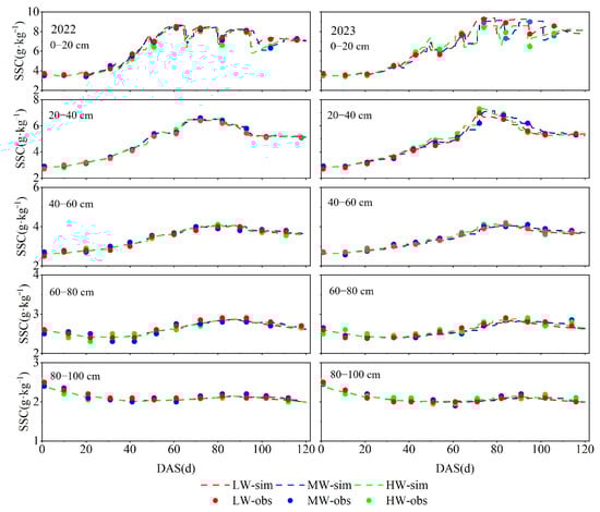 Implementing effective water conservation measures is crucial for safeguarding the soil and water ecosystem and mitigating soil erosion in dry regions [40]. By using a logical approach to the exploitation of water resources, it is possible to maintain soil moisture levels and support crop development, hence enhancing agricultural output [41]. Both measured and simulated data indicated that the water content of the soil in the 0~40 cm depth range of sunflower plants exhibited significant changes (p < 0.05) when subjected to varied volumes of irrigation water under drip irrigation with a membrane. However, there was no significant difference (p > 0.05) in the water content of the soil in the 40~100 cm depth range. During different fertility periods, the water content of the soil layer between 0 and 40 cm exhibited varying changes. In the seedling period, evaporation was not intense and the root system had a weak ability to absorb water, resulting in a high soil water content. In the elongation period and irrigation period, the soil water content was low due to the increased air temperature and strong crop physiological activity, which demanded a large amount of soil water. In the maturity period, the crop physiological activity decreased and the air temperature gradually declined, leading to an increase in the soil water holding capacity.