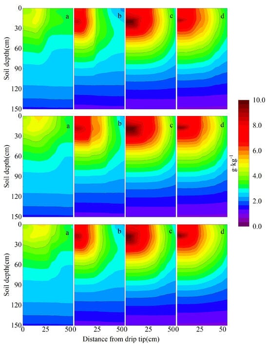 The dynamics and dispersion of soil salinity in 2022 and 2023 exhibit similarities, with 2022 serving as the benchmark year and 2023 as the validation year. Therefore, the data from 2023 have more representativeness. Hence, this article primarily examines the dispersion of soil salinity in 2023 in the absence of drip irrigation. Figure 10 illustrates the spatial arrangement of soil salt in the year 2023. The fluctuations in soil salinity mostly occurred at the 0~30 cm depth below the drip line and the root zone of sunflowers. This was primarily due to the influence of irrigation and the absorption of water by the roots.