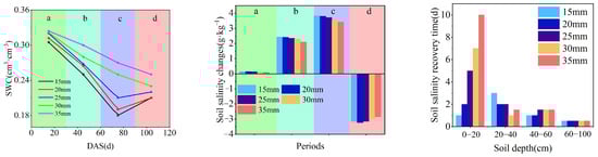 Changes in soil water content and salt accumulation under 15 mm, 20 mm, 25 mm, 30 mm, and 35 mm irrigation at different fertility stages of sunflower (a, b, c, and d in the figure are at seedling, nodulation, irrigating and maturity stages of sunflower, respectively) and the time of salinity rebound.