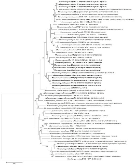 To reveal the relationship between the tested isolates and the most related reference strains at the species level, multilocus sequence analysis (MLSA) was carried out [31,32]. As a result, the maximum likelihood phylogenetic tree of the strains examined in this study and the valid taxa based on the concatenated 2620 bp of four housekeeping gene sequence fragments is presented in Figure 1. The tested strains were divided into two large groups (encompassing 15 and 4 strains) in a similar way as in the 16S rRNA gene phylogenetic tree. Strains 43, 249, 126, 29, 45, and 66 were grouped with the most closely related Micromonospora violae DSM 45888 (sequence similarity 97.4%). The second phylogenetic group comprised 152, 33, N2, 230, 30, and Micromonospora inaquosa LB39 as the most closely related reference species, with a sequence similarity range from 97.3 to 97.8%. Micromonospora purpureochromogenes DSM 43821 was the most closely related to strains 5056 and N5 (97.6–98.8% sequence similarity); strains 48 and N4 were closely related (99.1–99.5% sequence similarity) to Micromonospora tulbaghiae DSM 45142. Strains 53, 55, and 50 showed 99.1% sequence similarity to reference strain Micromonospora alfalfae MED01. Strain 5052 exhibitsed 98.5% sequence similarity with strain Micromonospora lupini DSM 44874.