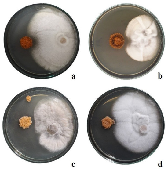 Zone of suppression of fungal growth, evaluated by dual culture plate assay. On the left side, the orange colonies of the tested bacteria against phytopathogenic fungi mycelium on the right side: (a) M. tulbaghiae 48 against F. equiseti; (b) M. tulbaghiae 48 against V. albo-atrum; (c) M. violae 66 against B. cinerea; (d) M. inaquosa 152 against F. equiseti.