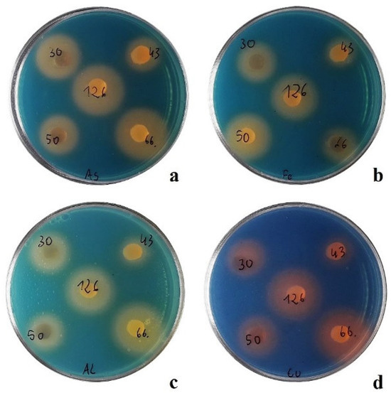 Orange halos around agar plugs cut from 7-day-old bacteria cultures on ISP2 agar. The results indicated the ability of M. inaquosa 30, M. violae 43, M. alfalfae 50, M. violae 66, and M. violae 126 to produce metallophores able to sequester metal ions from various types of chrome azurol S agar, with the addition of ions: (a) arsenic (As); (b) iron (Fe); (c) aluminum (Al); (d) copper (Cu). The numbers shown in the center of the halo zones refer to the designations of the tested bacterial strains (Table S1, Supplementary Information).