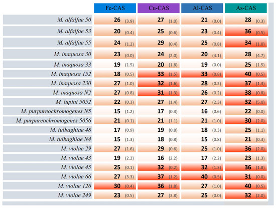 The ability of Micromonospora strains to produce various metallophores was evaluated on chrome azurol S agar supplemented with ions of iron (Fe), copper (Cu), aluminum (Al), and arsenic (As). The halo zones around agar plugs cut from 7-day-old bacteria cultures (on ISP2 agar) were measured after 14 days of incubation at 28 °C. The average diameter of halos [mm] was calculated using the arithmetic mean from triplicates. Values in brackets represent standard deviation.