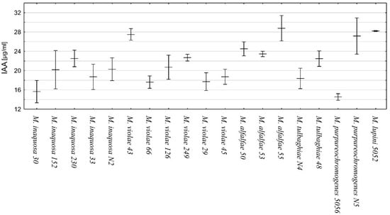 The spectrophotometric comparison of the standard curve of IAA and that of the samples of bacterial supernatant and Salkowsky reagent indicated the ability of all the studied strains of Micromonospora to produce IAA as a result of tryptophan metabolism (Figure 6). M. alfalfae strain 55, M. purpureochromogenes strain N5, M. lupini strain 5052, and M. violae strain 43 showed the highest productivity (above 27 µg/mL). The lowest amount of IAA was detected for M. purpureochromogenes strain 5056.