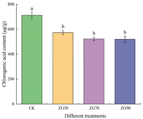 Chlorogenic acid content of M. tenacissima under different light intensity treatments. ZG50, ZG70, and ZG90 indicate illumination using natural light, with shading rates of 50%, 70%, and 90%, respectively. CK indicates control. Different letters indicate significant differences between different treatments (p < 0.05).