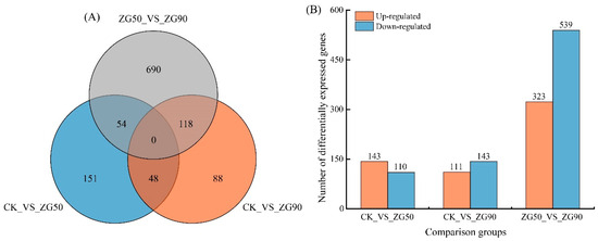 A total of 1149 DEGs were identified in the three comparison groups. In total, 151, 88, and 690 DEGs were only expressed in CK_VS_ZG50, CK_VS_ZG90, and ZG50_VS_ZG90 comparison groups, respectively. There were DEGs in each of the two comparison groups, but there were no DEGs commonly expressed in the three comparison groups (Figure 2A). In the CK_VS_ZG50 comparison group, the expression levels of 143 and 110 genes were up-regulated and down-regulated, respectively. In the CK_VS_ZG90 comparison group, 111 and 143 gene expression levels were up-regulated and down-regulated, respectively. Furthermore, the expression levels of 323 and 539 genes were up-regulated and down-regulated, respectively, in the ZG50_VS_ZG90 comparison group (Figure 2B).