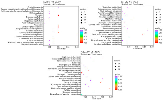 KEGG enrichment analysis of DEGs in different comparison groups. (A), CK_VS_ZG50, (B), CK_VS_ZG90, and (C), ZG50_VS_ZG90 comparison groups. Number indicates the gene number enriched in the KEGG pathway. Q-value indicates the corrected p-value to judge the enrichment significance.