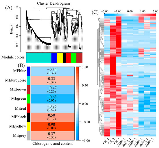 Weighted gene co-expression network analysis of the DEGs identified in the light treatment of M. tenacissima. (A) Dendrogram with co-expressed gene modules. (B) Module–trait correlations and p-values (in parentheses) with chlorogenic acid content. The color scale on the right presents the module–trait correlations from −1 (blue) to 1 (red). (C) Heatmap of DEGs in the MEyellow module. Height is the distance of merging similarity modules.