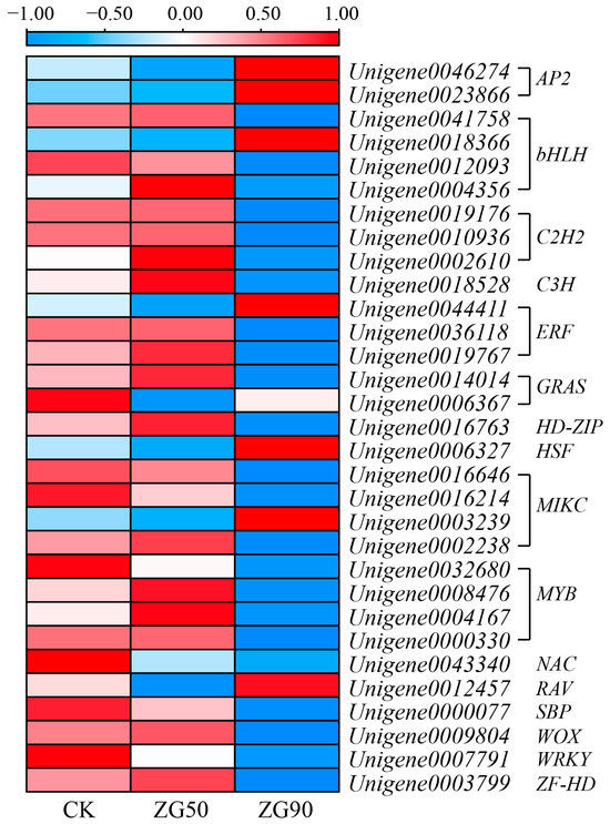 Transcription factors potentially involved in light-induced chlorogenic acid accumulation were analyzed, and the heatmap was drawn (Figure 6). A total of 31 differential transcription factors were identified, including 16 transcription factor families; among them, the 3 families of bHLH, MIKC, and MYB had the largest number of differential transcription factors, which was 4 for each. At the same time, the most differential transcription factors were highly expressed in CK and ZG50; the number of differential transcription factors highly expressed in ZG90 was lower; and most of the differential transcription factors had low expression in ZG90. Combined with WGCNA results (Figure 4), the correlation between gene expression and chlorogenic acid content was higher in the MEyellow module. In this module, four differential transcription factors were identified: Unigene0032680 (MYB), Unigene0000077 (SBP), Unigene0016214 (MIKC), and Unigene0016646 (MIKC). These four TFs were highly expressed in the CK, and the expression level decreased under different light intensity treatments.