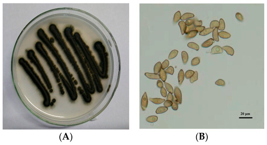 Colony growth of (A) Venturia nashicola and microscopic morphology of (B) conidia on oat agar medium (25 °C, 10 days).